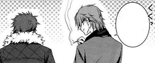 Kusanagi and the others are confronted by Scepter 4 in the hotel's lobby and prepare to fight them. However, after unknown circumstances, Mikoto is locked up in jail, while the others return to their daily lives as members of HOMRA. It is not long after, however, that they find a person who coincidentally looks like their target, resulting in a pursuit of the white-haired teenager. Kusanagi joins Yata, Kamamoto and Shōhei in the chase; together, they corner him in an alley, where Kusanagi attacks with fireballs ignited from the sparks of his cigarette. However, their target is saved by the unexpected Kuroh Yatogami, causing Kusanagi to take action with their Plan B.[3]