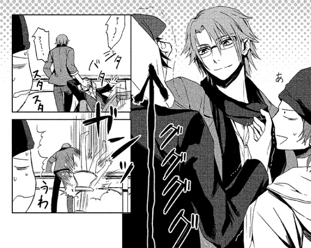 Several days later, Shōhei left the building on a rainy day, after which Totsuka spoke to Kusanagi about how he tended to worry the others. Kusanagi said that they seem to have gotten used to things. Then, he asked whether they should be worrying about a then-intoxicated Bandō, who started to disrupt the peace in the building. Calmly, Kusanagi beat him into a more composed state and asked if he would like to share anything with them; intimidate, Bandō submits. Kusanagi is then explained why Bandō disliked Shōhei so much and tried reasoning with him, even telling him that his hate was one-sided. However, his words apparently did not reach Bandō.[12]