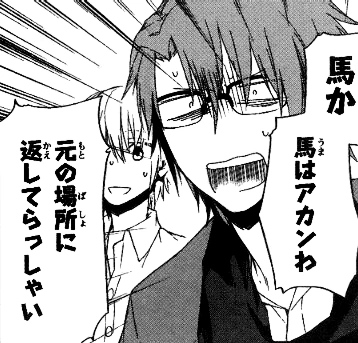 Over a month later, Kusanagi was asked to allow another animal in the bar by Kōsuke and Anna. Though reluctant, he eventually allowed it after Anna kept using her cute charms on him. He was then taken outside to see what animal it was. To his shock, Kusanagi discovered that it was actually a horse, and despite then opposing the very idea of allowing a horse, he was forced to keep his words. He would grumble about it inside the bar while the horse was drinking water. In addition, he became more irritable with his Clansmen. Though, he did join Mikoto with his dark joke about cooking the horse as food.[27]