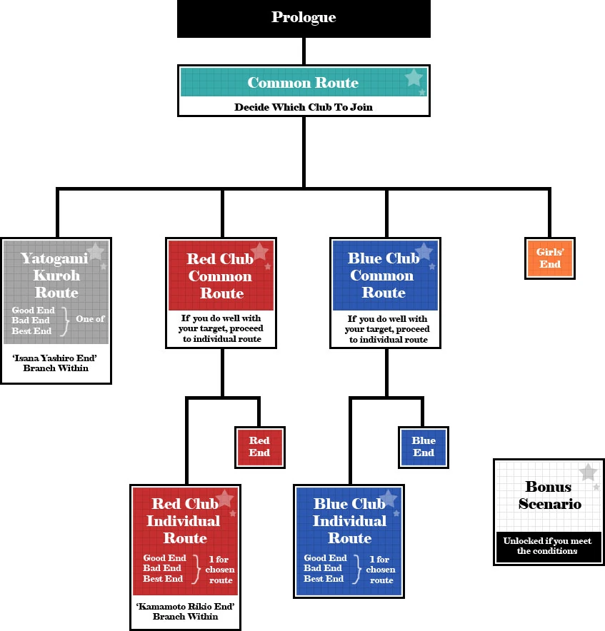 - The Blue Club, led by Reisi Munakata. Their club mostly revolves around maintaining order around the school, Student Council duties, and event preparations.