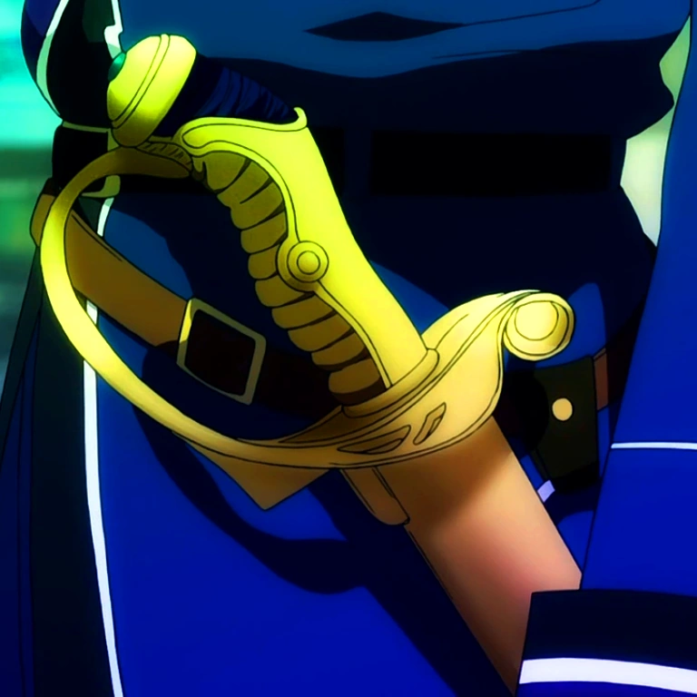 Sirius (天狼, Tenrō):[1] Munakata wields a saber in combat. The handle is golden colored with a streak of blue near the tip, which is adorned with a sphere that emits a green light when Munakata is about to unsheathe the weapon. The button appears to be connected to the sheathe; once it emits the light, the lock on the hilt is released. The sheathe is dark blue and contains several golden colored straps over it.[7]
