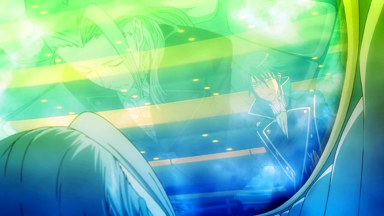Munakata agrees that the Slate is dangerous, although he points out that the late Gold King wouldn't have been able to make the country as powerful as it is today without it, and the system cannot be lost since the Slate is deeply rooted in it, and affirms that as the Blue King, he will reinforce order, considering the roles of the other Kings. Kusanagi tells him that he is in no position to make such a statement, and Anna reminds him that his Sword of Damocles will fall if he pushes himself any further, making Munakata laugh, and confess how he had told the late Mikoto Suoh the same thing, although his late friend ignored his warnings. He turns to Anna when she says his name softly, and is stunned when she reminds him that he is different from Mikoto.